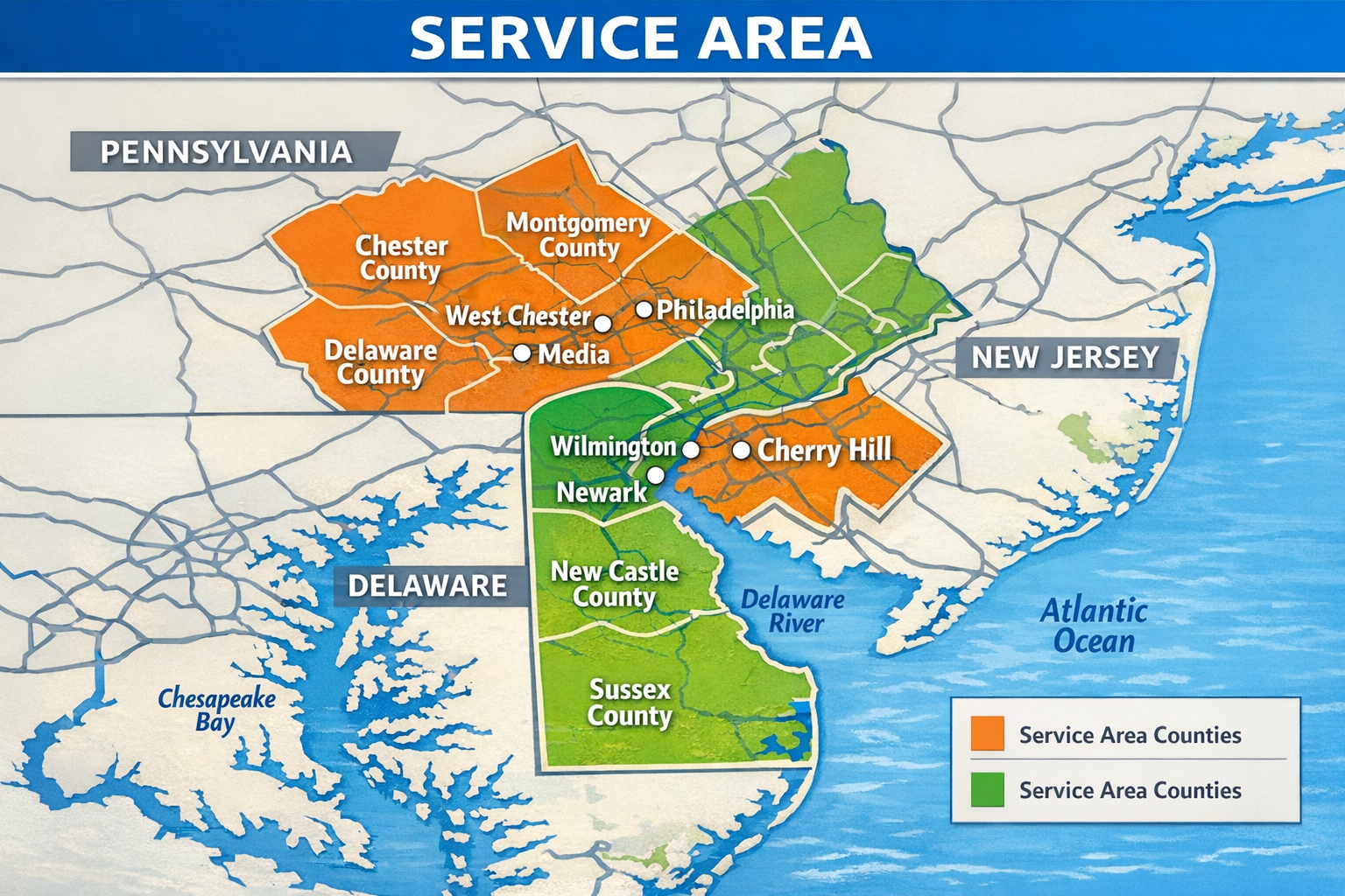Including Wilmington, Newark, Dover, West Chester, Media, and Cherry Hill.